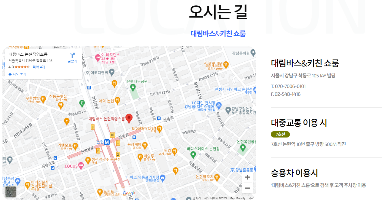 | 대림바스 논현직영쇼룸 | 서울 강남구 학동로 105 | 070-7006-0101 |