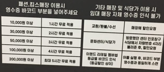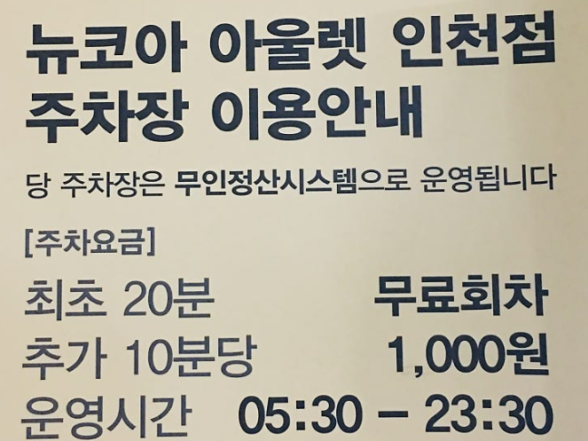 뉴코아아울렛 인천점 구매 금액별 무료주차 시간