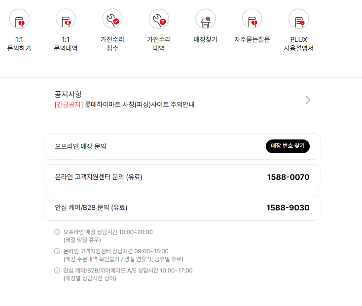 - 위 안내된 롯데하이마트 고객센터(1588-0070)로 전화합니다.