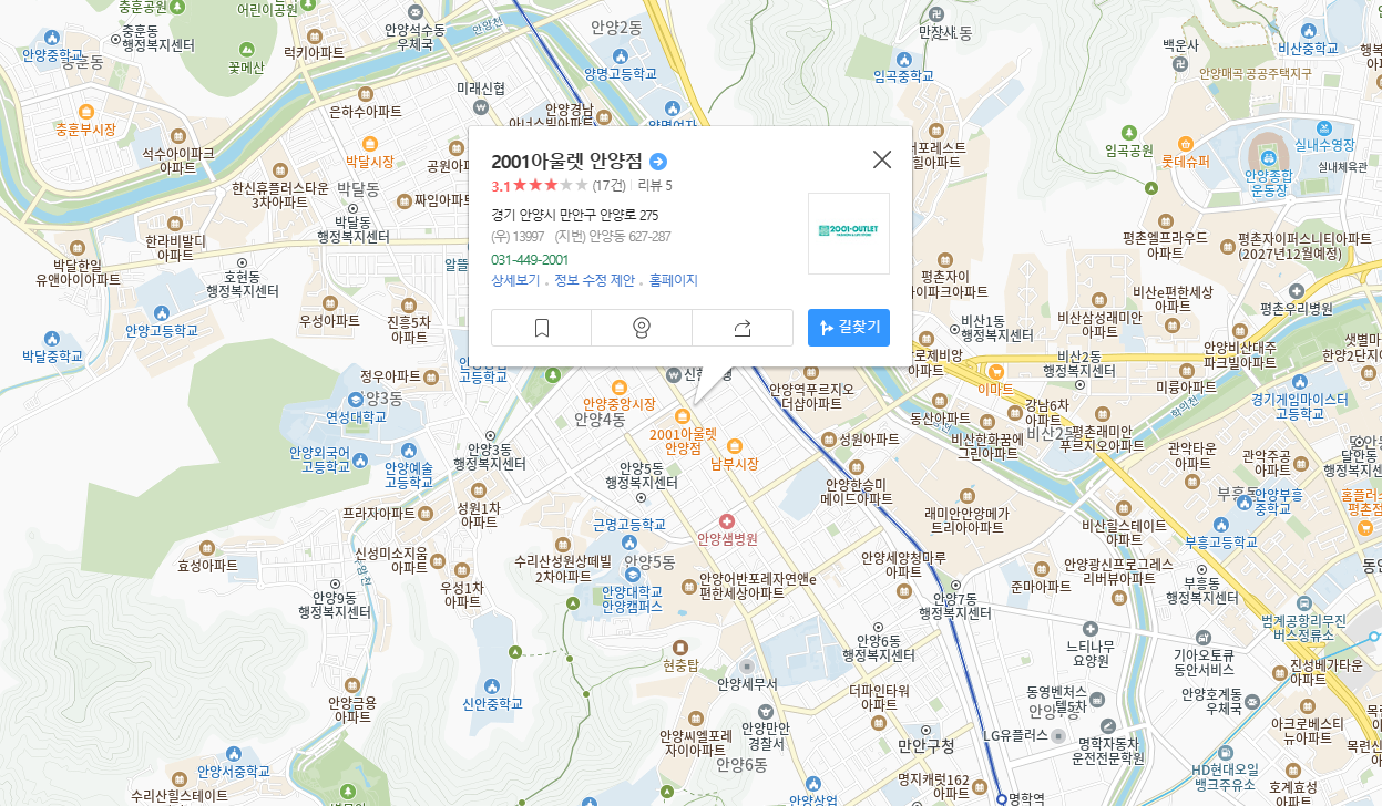 2001아울렛 안양점 주소 : 경기도 안양시 만안구 안양로 275(지번:안양동 627-287)